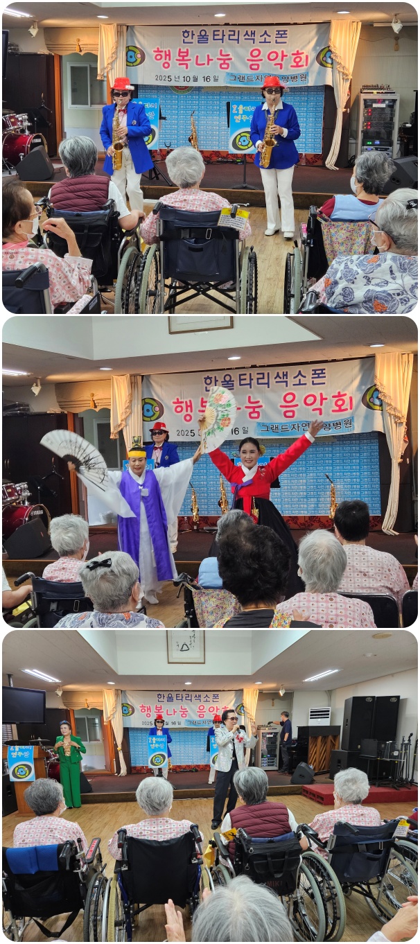 그랜드자연요양병원은 10월 16일 한울타리 색소폰의 <행복 나눔>공연으로 작은 음악회를 열었다. 이날 공연은 <소양강 처녀>, <부산 갈매기> 등의 색소폰 연주와 <창부타령>, <밀양 아리랑> 등의 옛가요, 민요로 어르신들과 함께 즐거운 시간을 마련했다.
