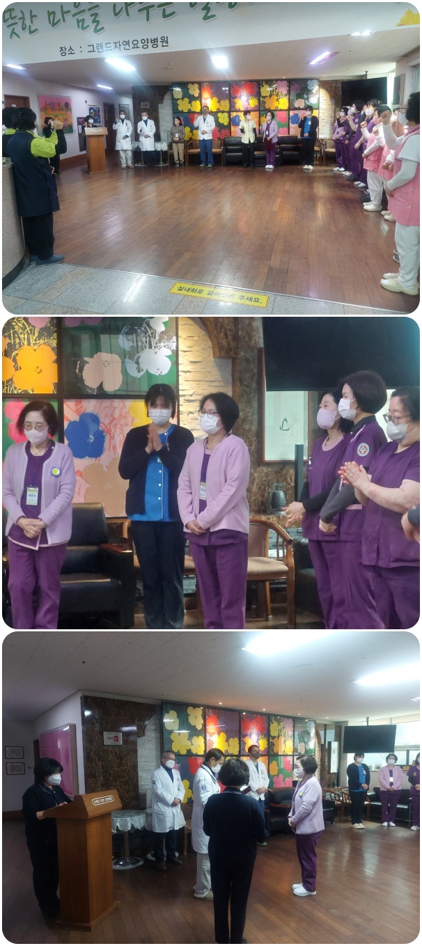 그랜드자연요양병원은 2월 2일 1층 로비에서 전 직원들이 참석한 가운데 그랜드자연 월례회를 가졌다. 환절기 어르신들의 건강 관리에 만전을 기하자고 강조하였으며, 이어서 신입직원들의 인사와 공로상 전달이 이어졌고 QPS위원회 위원과 감염관리위원회 위원의 새로이 임명되는 위원에 대한 임명장을 수여하였다.