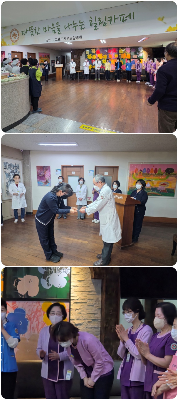 그랜드자연요양병원은 4월 6일 1층 로비에서 전직원들이 참석한 가운데 그랜드자연 월례회를 가졌다. 하필성 부원장은 어르신들의 건강 관리에 만전을 기하자는 말씀과 함께 수고하는 직원들을 격려하였다. 이어서 신입직원들의 인사가 이어졌고 봄내음이 짙어가는 4월을 준비하는 마음으로 "그랜드 그랜드 힘!"의 구호와 함께 4월 월례회를 마쳤다.