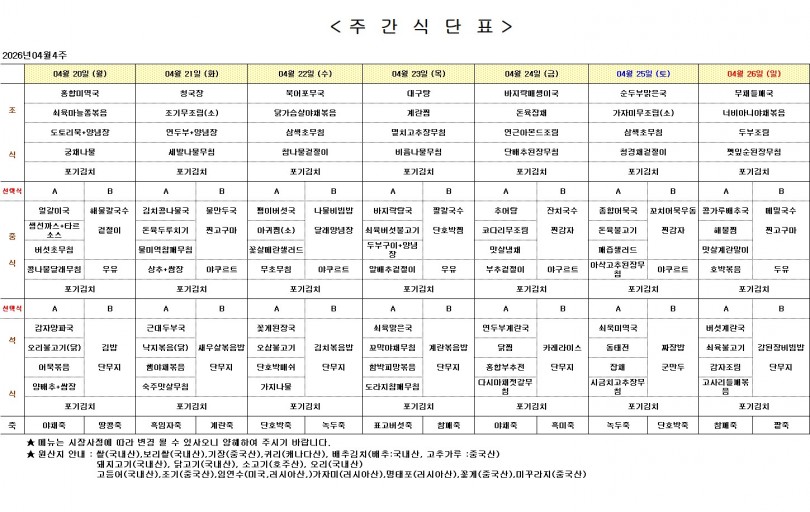 주간 식단표 (4월 4주) 페이지 정보 작성자 최고관리자 작성일26-04-17 10:24 조회56회 댓글0건 이전글 다음글 목록 본문 주간 식단표 (4월 4주) 댓글목록 등록된 댓글이 없습니다. 이전글 다음글 목록